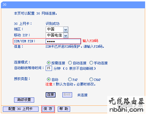 3G上网卡启用PIN码保护,路由器能识别到3G上网卡,但无法拔号,如下图所示: