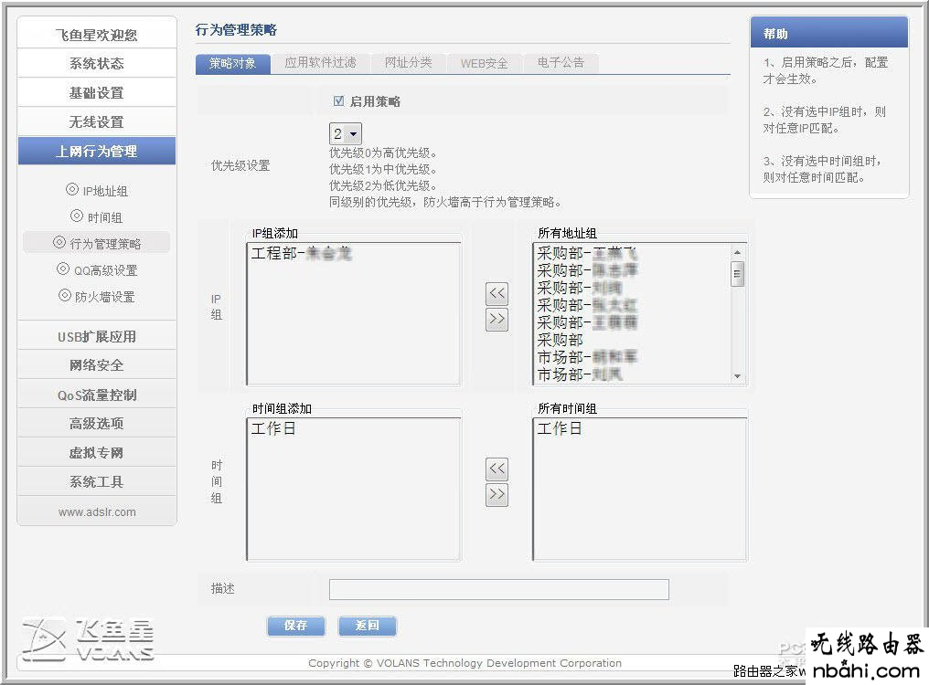 管理的对象设定,从我们之前的IP地址组中选择,这里如果是单个IP的话,就更精确了,直至目标,在加上管理的时间段,这样管理即合理也比较人性化,有选择的余地。