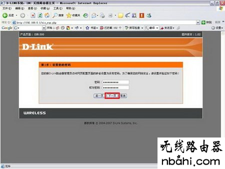 默认状况下,进入路由器配置界面的管理密码为空,为了保证该设备的安全,您可以设置一个密码,以防止别人更改您的路由器的配置;请您将所设置的登录密码记下,否则日后可能无法登录DI-524M的设置界面;如果忘记登录密码的话,您将路由器进行复位操作,具体方法请参见相应说明。在填入两遍密码后,点击下一步,进入时区的设置。您也可以不设置密码,那么直接点击下一步即可。