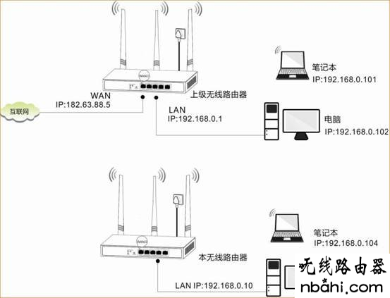 将两台无线路由器的LAN口地址设置为同一网段的不同IP地址,如上级无线路由器的LAN口地址是192.168.0.1,则可设置无线路由器LAN口IP地址为192.168.0.X(3~254);