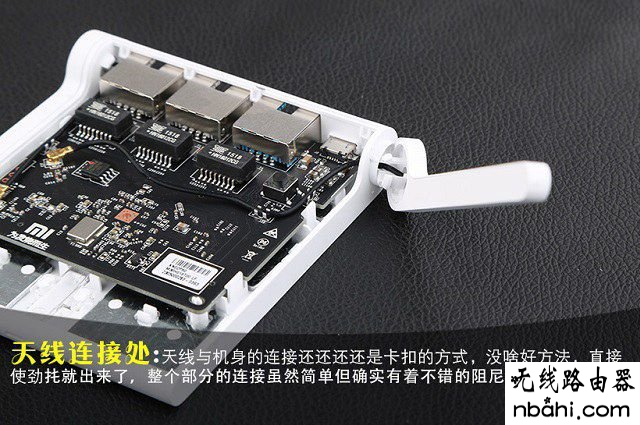 3、小米路由青春版的天线也是可以拆卸的,天线与机身的连接还是卡扣式固定方式,没啥好方法,直接使劲托就出来了,整个部分的连接虽然简单,但确实有着不错的阻尼感。