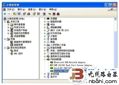首先要确认笔记本的硬件配置正常,如无线网卡驱动是否安装。 桌面右击“我的电脑”,点击“管理”菜单进入,进入计算机管理界面,打开“系统工具”菜单,双击进入“设备管理器”界面